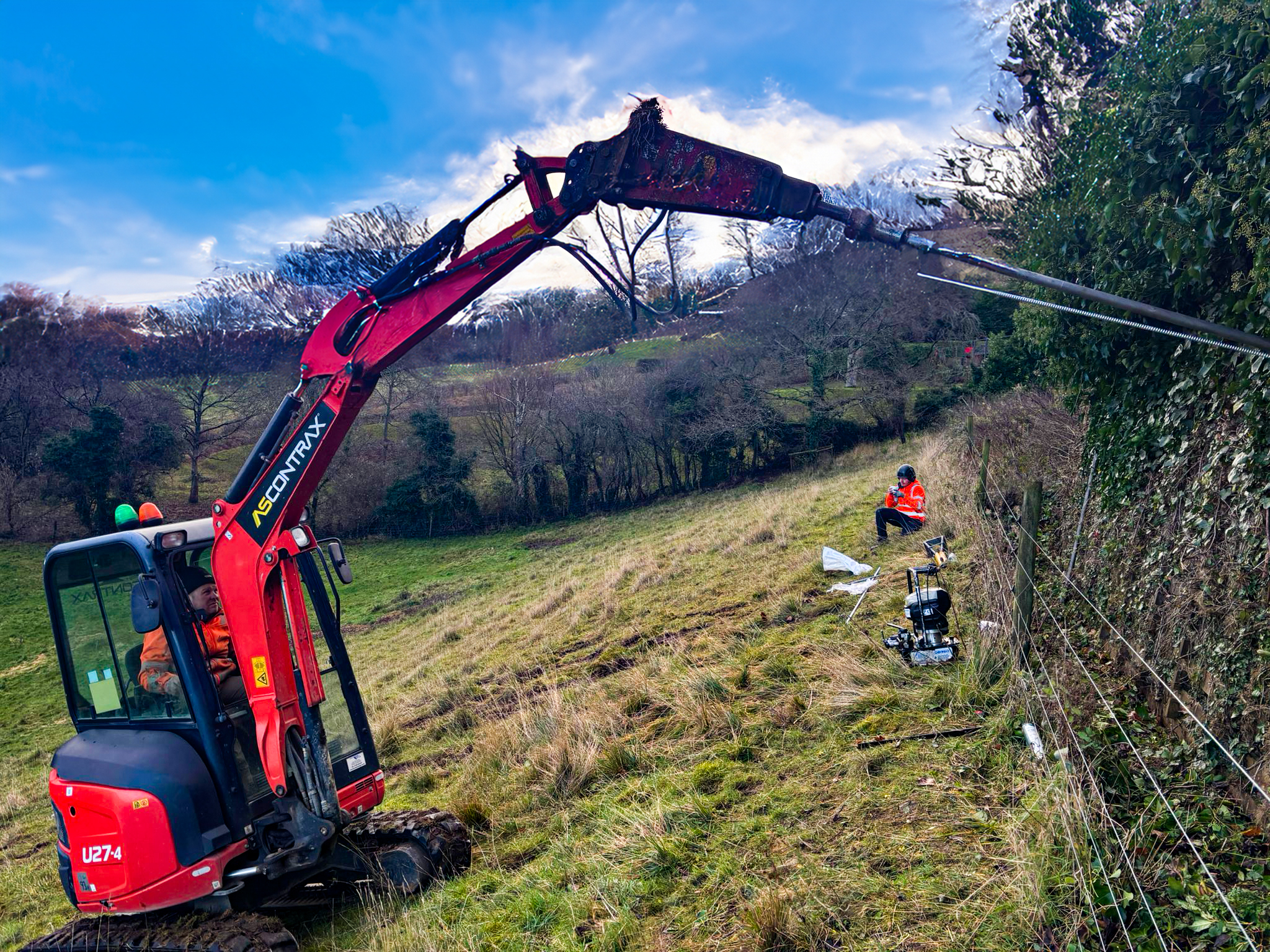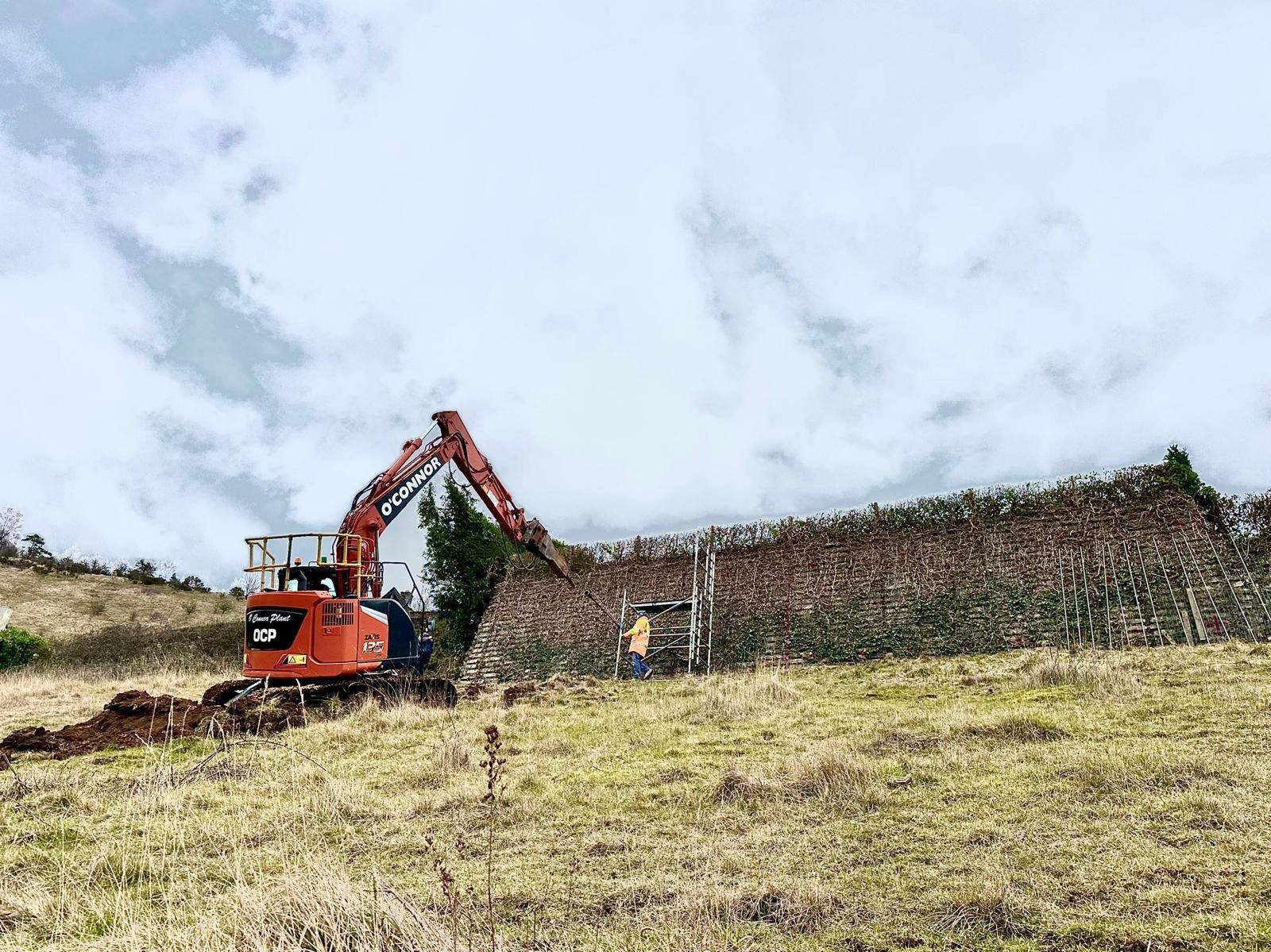 The site presented access challenges due to a slope in front of the wall. To mitigate this, a 13-tonne excavator with steel tracks and a pecker was used. Anchor Systems’ proprietary 20T ram and battery-powered pump were employed for loading and lock-off procedures.