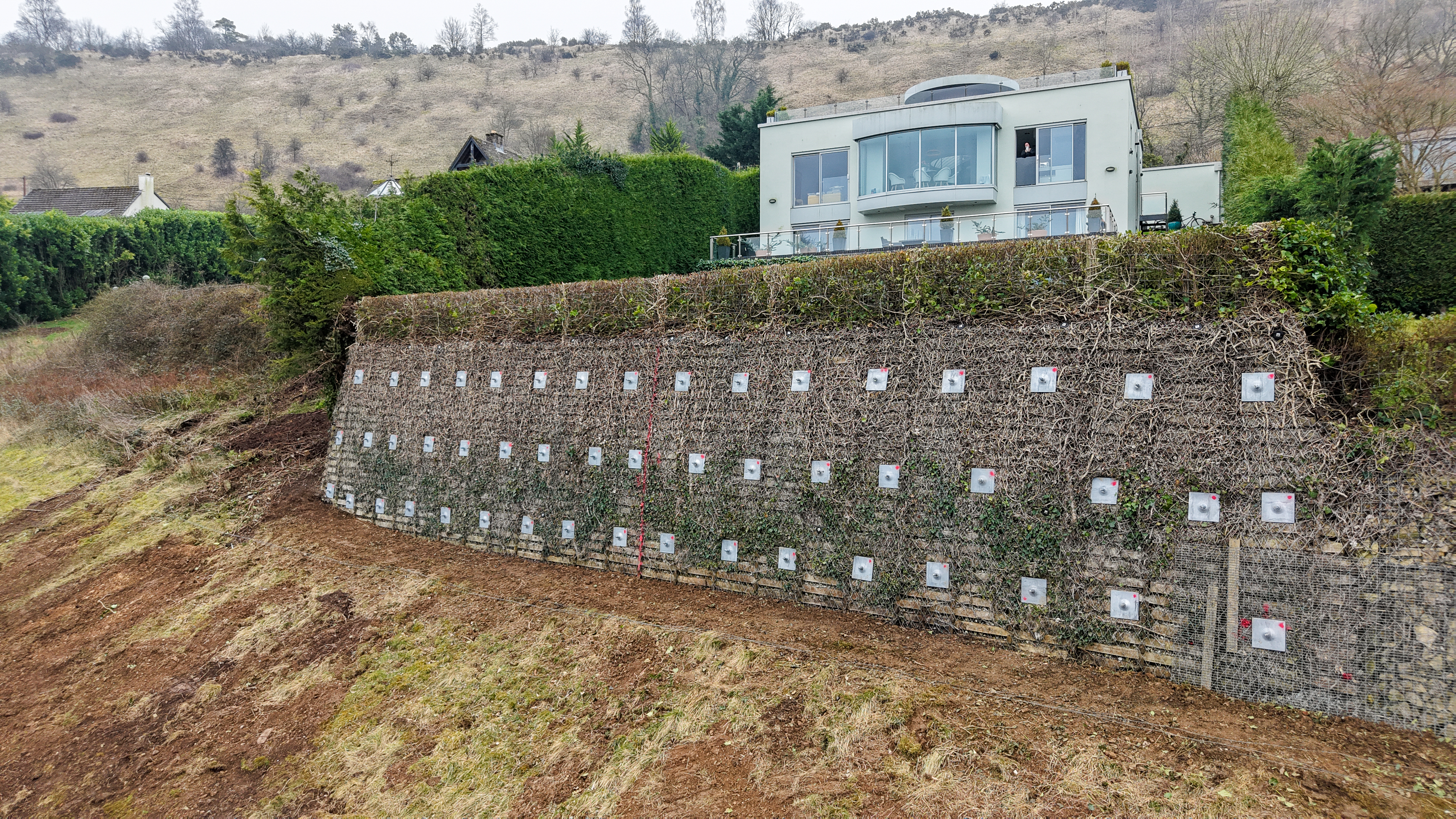 A roll of Deltax meshing was applied to the wall face, anchored by the geo-textile units.