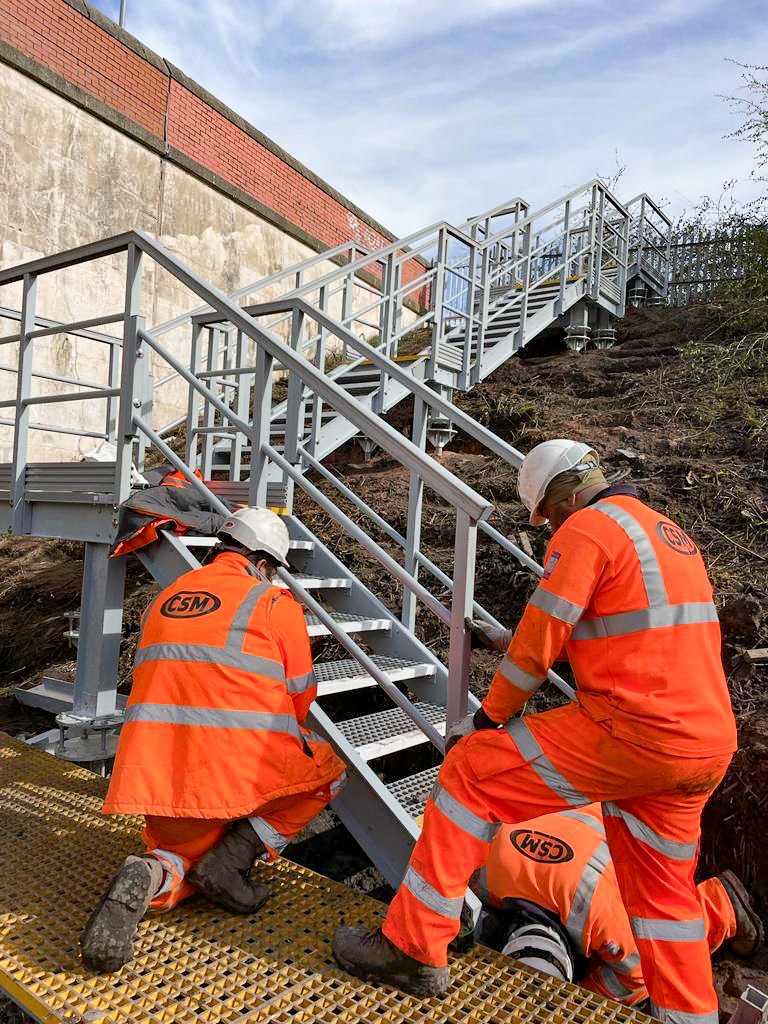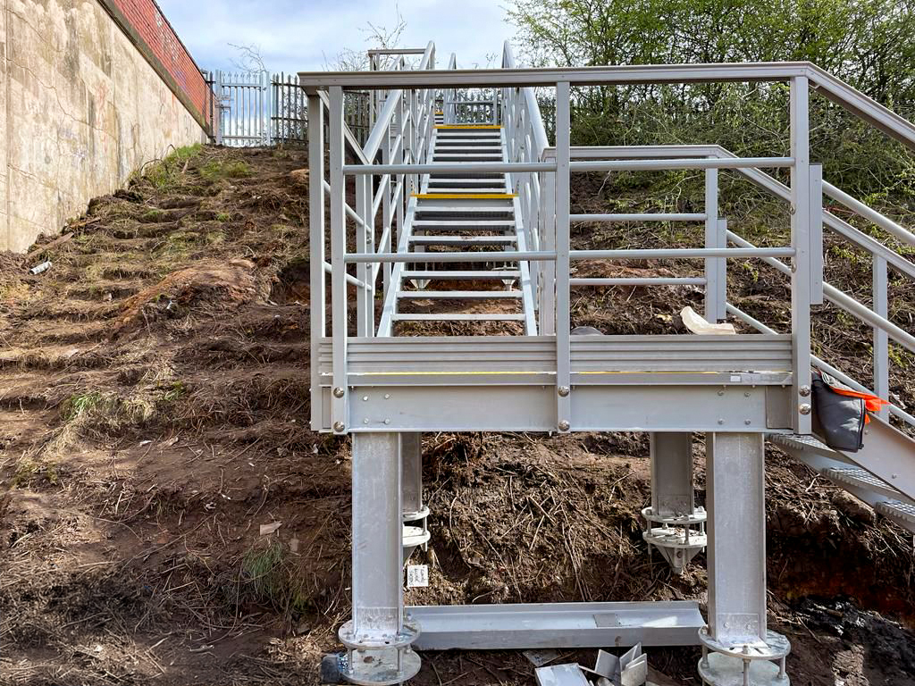 The project involved installing a 13m long and 5m high GRP staircase on a sloped railway embankment in Knowsley, Merseyside. This staircase was designed to provide safe access between the embankment and a cess walkway, equipped with a self-closing safety gate.