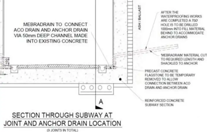 ASIL proposed the Anchor Drain solution which has been tried and tested on a number of structures over the years. The Anchor Drain is used to permanently dewater structures that do not have adequate drainage normally as a result of blocked drainage systems. ASIL provided the innovative retrofit technology expressly for aged and poorly drained structures. The Anchor Drain was tied into the existing ACO drain system that is used to carry water away from the structure as per the detail shown below.