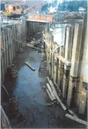 Alfred McAlpine Construction first installed a row of sheet piles, some 2m from the existing bank retaining wall, which were tied across the river. A second row of piles was installed behind the wall and the area between the two rows of piles pumped out to allow a 150m section of the wall to be cut away. The landside piling then had to be anchored to allow a new retaining wall to be constructed and the section filled to support the widened slip road.