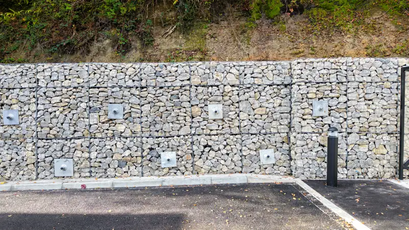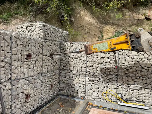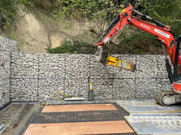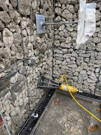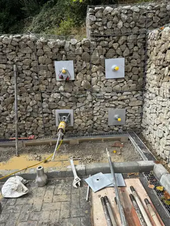 The anchors were installed using a small excavator, allowing for precise placement even within the confined workspace. Despite the limited access and the challenges of working with an existing gabion structure, the Anchor Systems solution provided a straightforward and effective method of reinforcement without requiring any bespoke or non-standard components.