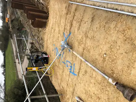 Ground investigation data provided by the client suggested that the anchors would be installed into made ground forming the motorway embankment, a material that can be challenging to work with, due to its varied nature. The required prop forces were defined by the client which allowed Anchor Systems’ in-house design department to select the AS-300 as the correct anchor from its range of Vulcan Earth Anchors. Once the initial concept was approved by the client, an indemnified design was provided. This identified the tendon diameter based on load requirements and the acceptable deflections of the sheet pile wall.