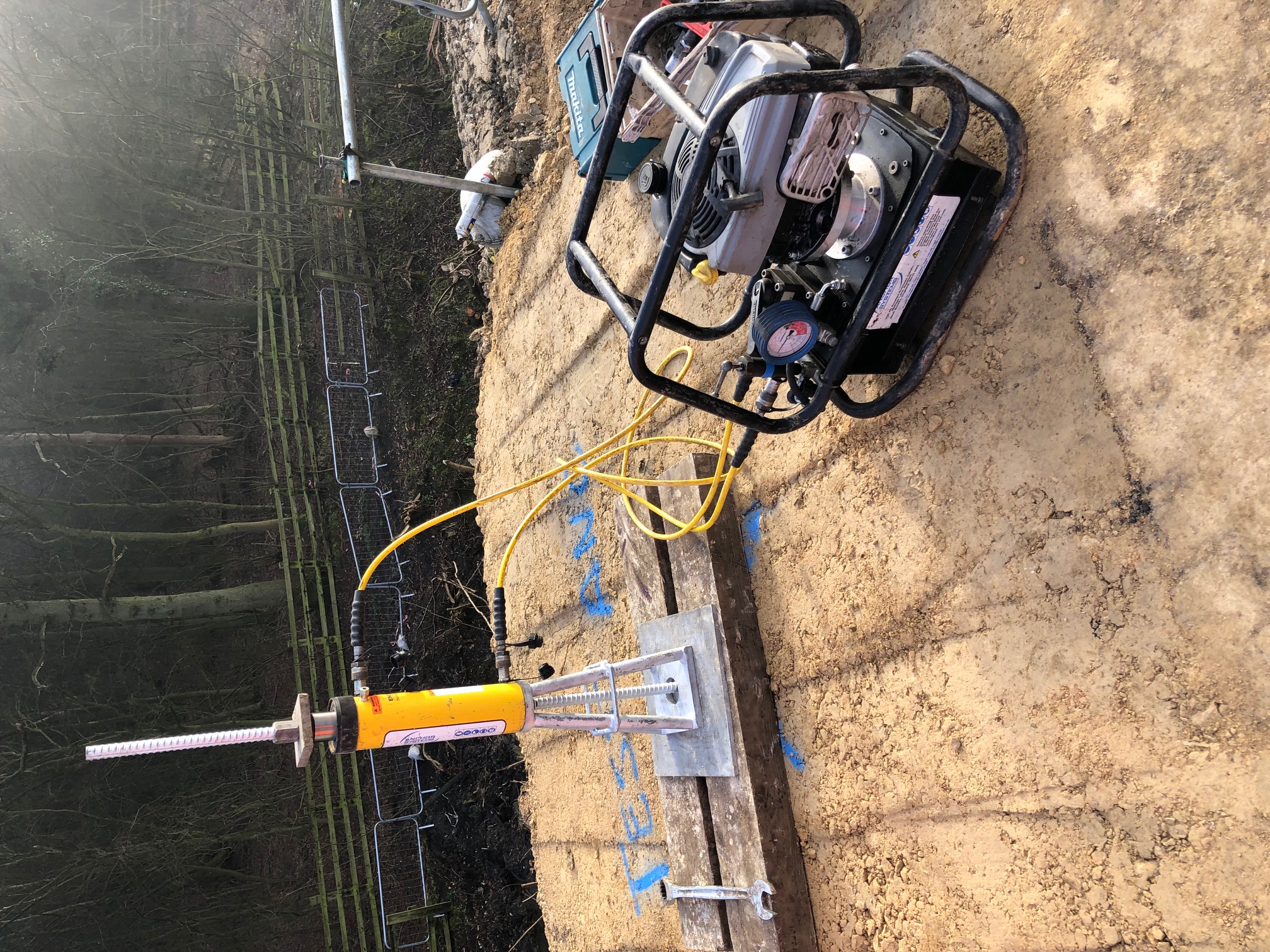 To validate the design, which up to this point was based on interpretation of ground investigation data, a series of test anchors was installed and tested to ensure they met or exceeded the predicted performance. Programme constraints meant that vertical test anchors had to be used, installed behind the pile line such that they intersected the stratum where the live anchors would be positioned. Under the supervision of Anchor Systems staff, four test anchors were installed by Van Elle, one at each bridge abutment, using a hydraulic breaker mounted on a 13t excavator. These were then “load locked” using a high pressure hollow hydraulic ram, achieving a maximum load of 220kN, which is greater than that achievable by other UK ground anchor manufacturers. The load information, together with details of the installation time, was then used by Anchor Systems’ design department to substantiate the original design. The final design document was then passed to the client for its review and acceptance. Following on from a successful acceptability test and geotechnical design, the systems were approved and installed successfully.