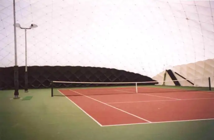 Cable Domes chose mechanical ground anchors. The structure measures 37.5m square and is kept inflated by a constant flow of air into the dome. Air pressure is maintained during entry and exit by a revolving door.