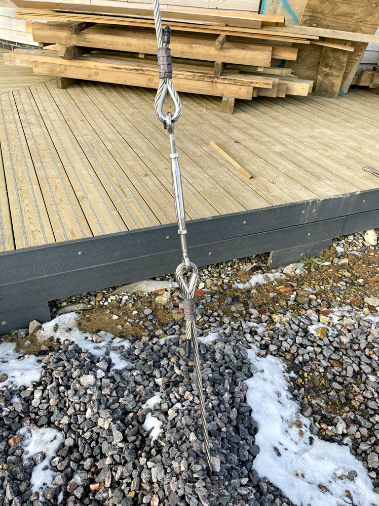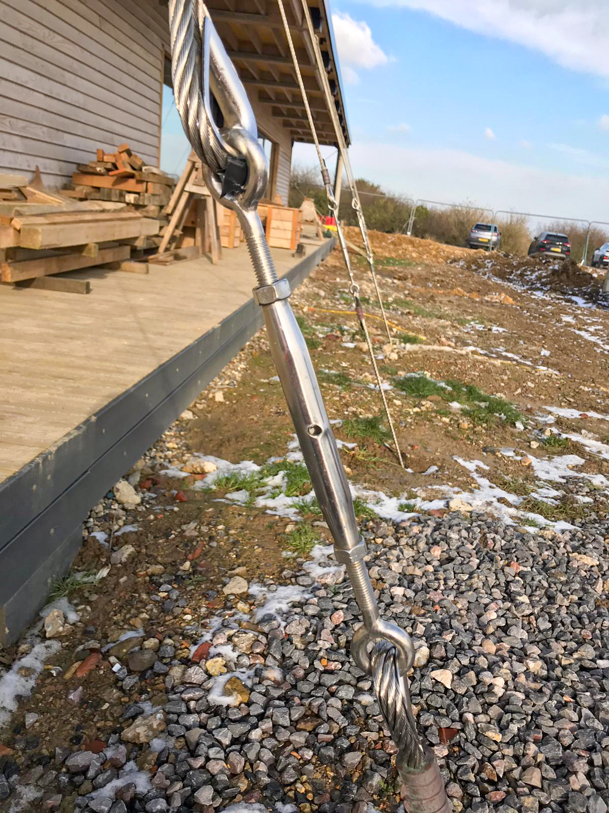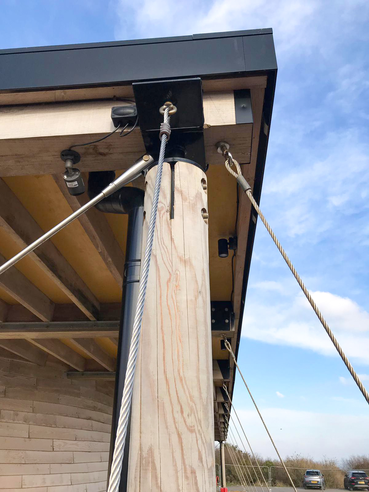 Tensioning System: 12mm stainless steel guying wires fixed through the beams and run down to the anchors at 20° angles, tensioned with 12mm stainless steel turnbuckles