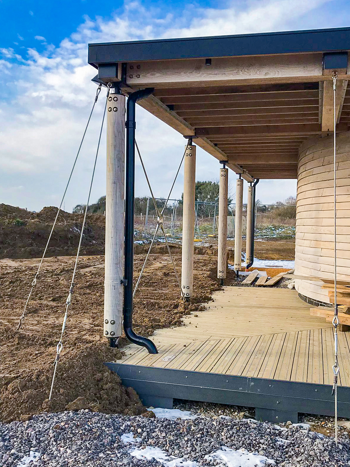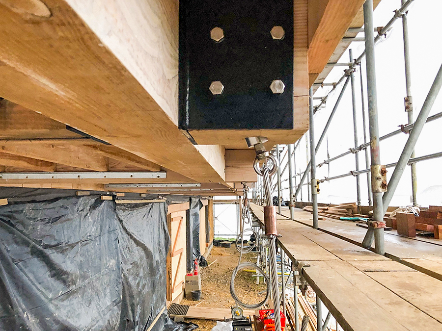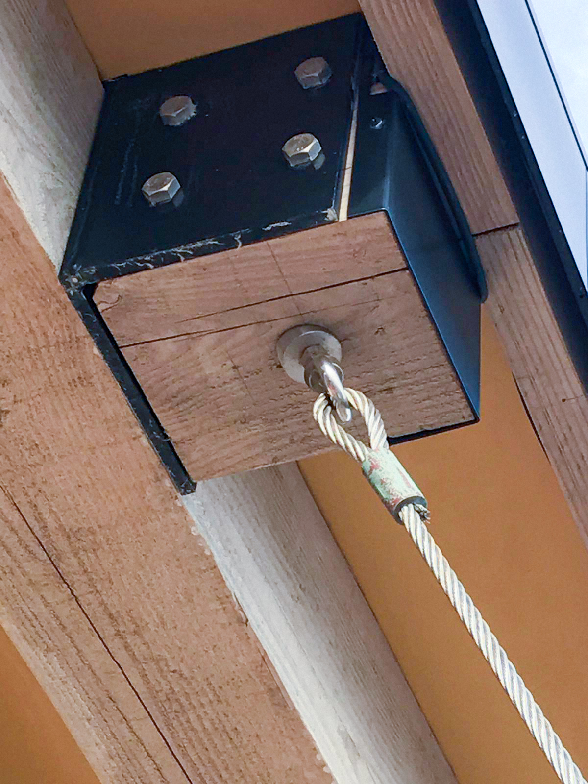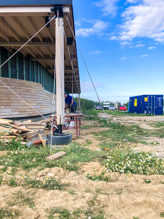 Tensioning System: 12mm stainless steel guying wires fixed through the beams and run down to the anchors at 20° angles, tensioned with 12mm stainless steel turnbuckles