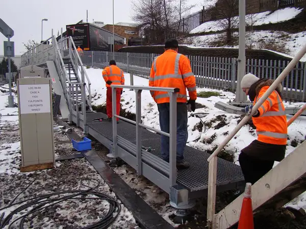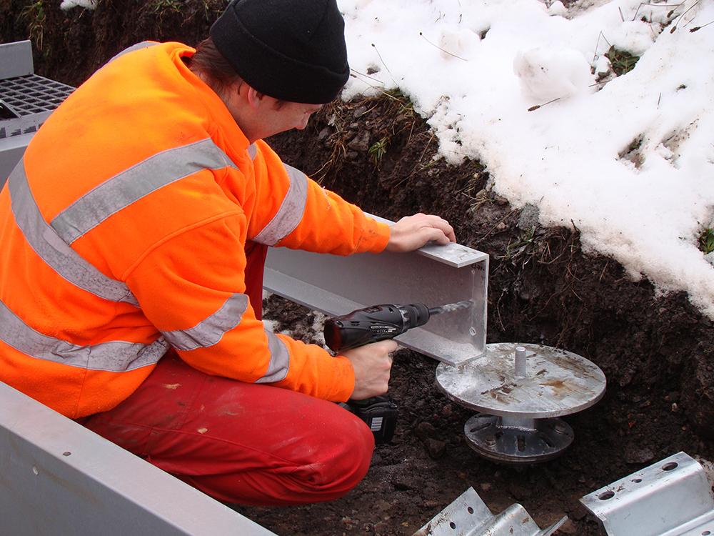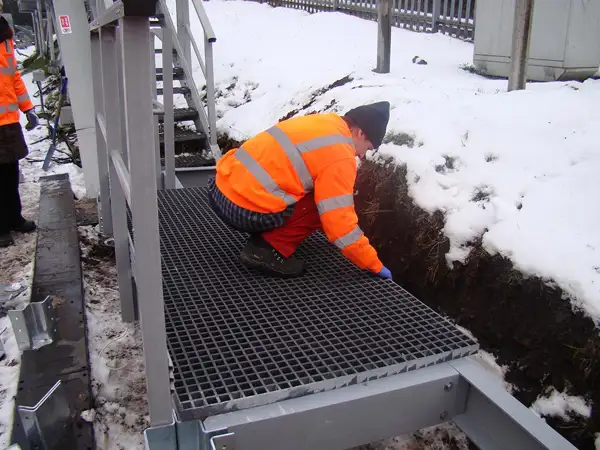 Once the foundations were in position all the cross beams and ties were placed on the Anchor Post interface plate supports and aligned to the foundation drawing and all fasteners were tightened as required. Hand Rails and the durable floor matting was positioned and fixed on the beams.